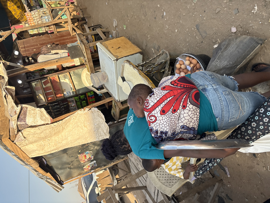 A woman carries a baby strapped to her back using a patterned wrap. She holds a silver tray. A child sits to her left. Behind her is an open market stall with shelves of goods, a small refrigerator, and a bucket full of eggs. The ground is dirt and rubble. The scene is bathed in sunlight.