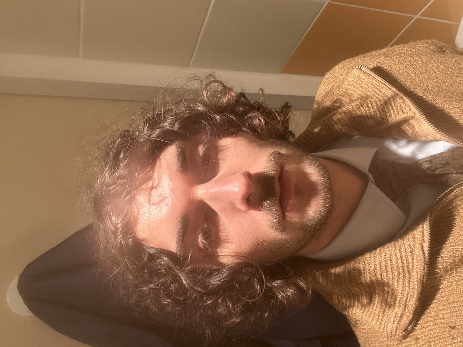 An indoor portrait image, located in Chatou, France, depicts a male subject from the chest up, positioned centrally and facing directly towards the camera. The subject possesses fair skin, dark brown curly hair, a prominent mustache, and a light beard. He is dressed in a light blue collared shirt, a patterned tie featuring brown and gold tones, and a light brown, ribbed knit zip-up cardigan. Strong, possibly artificial, lighting originates from above and slightly in front, creating noticeable shadows beneath the subject's nose and chin, and producing a circular lens flare effect in the upper center of the frame, partially obscuring the hair. The background consists of light-colored, possibly beige, tiled walls on the right side, showing at least two horizontal grout lines and a lower section of orange-brown tiles. On the upper left, a dark blue fabric item, possibly a garment, hangs from a white wall hook. No other individuals are present.