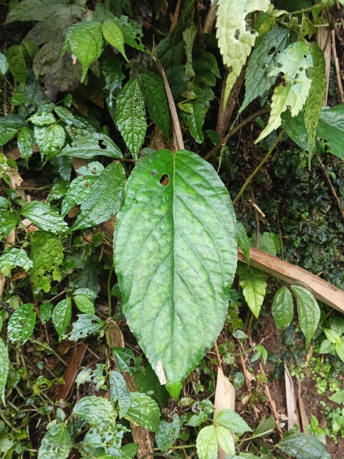 The scene depicts dense, verdant foliage in Situm, Papua New Guinea. A prominent, ovate, dark green leaf with visible venation occupies the center, exhibiting a roughly circular hole in its upper left quadrant. The leaf surface appears moist or glossy. Surrounding the central leaf is a thick array of other green leaves, varying in size and shade, many displaying signs of natural wear such as irregular edges, tears, and smaller perforations. Intertwined within the vegetation are several brown woody stems and branches. A broader, light-brown wooden element, possibly a bamboo stalk or a fallen branch, is visible horizontally in the lower right portion of the image. The environment is natural, outdoor, and consistent with a humid, overgrown setting, with no individuals, animals, or artificial structures present.