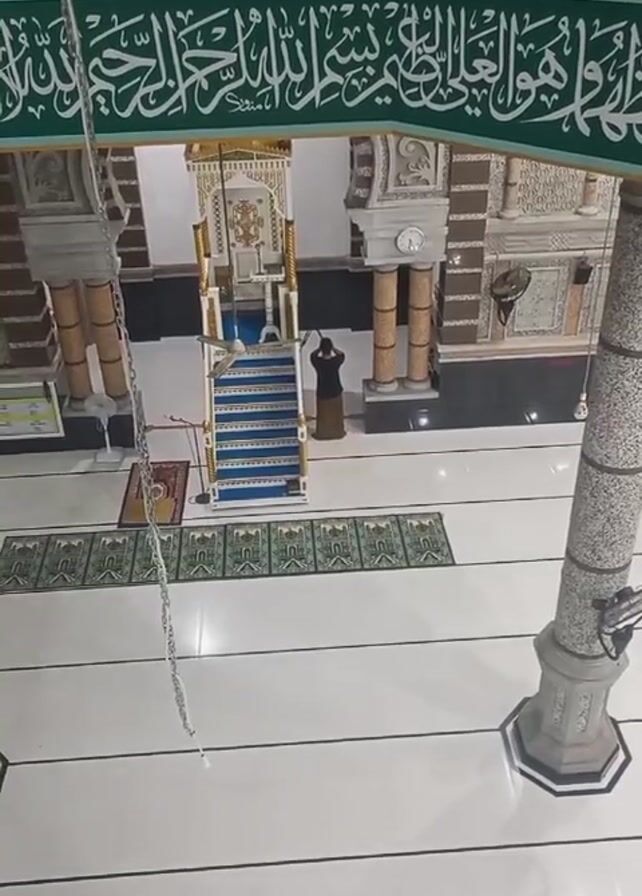 n elevated view of a mosque's interior. A person wearing dark clothing and a head covering stands near a blue and white pulpit with stairs leading up to it. The floor is white and gray with green patterned rugs. The mosque features columns, a clock, a fan, and ornate Islamic calligraphy along the upper sections of the walls. A chain hangs down in the foreground, and the sound of a call to prayer is audible.