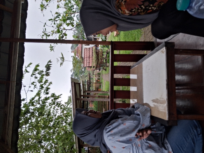 Two people are sitting at a table on a porch. One person wears a grey hijab and blue patterned shirt, the other wears a grey hijab and dark patterned shirt. The table is white with brown trim. Outside, there is green vegetation and a house with a red tile roof. There are trees on the left side of the image. The day appears overcast.