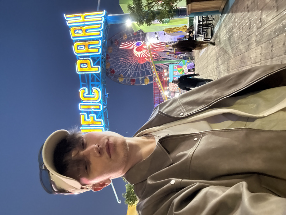 A young man takes a selfie against the backdrop of Pacific Park's illuminated sign and Ferris wheel at night