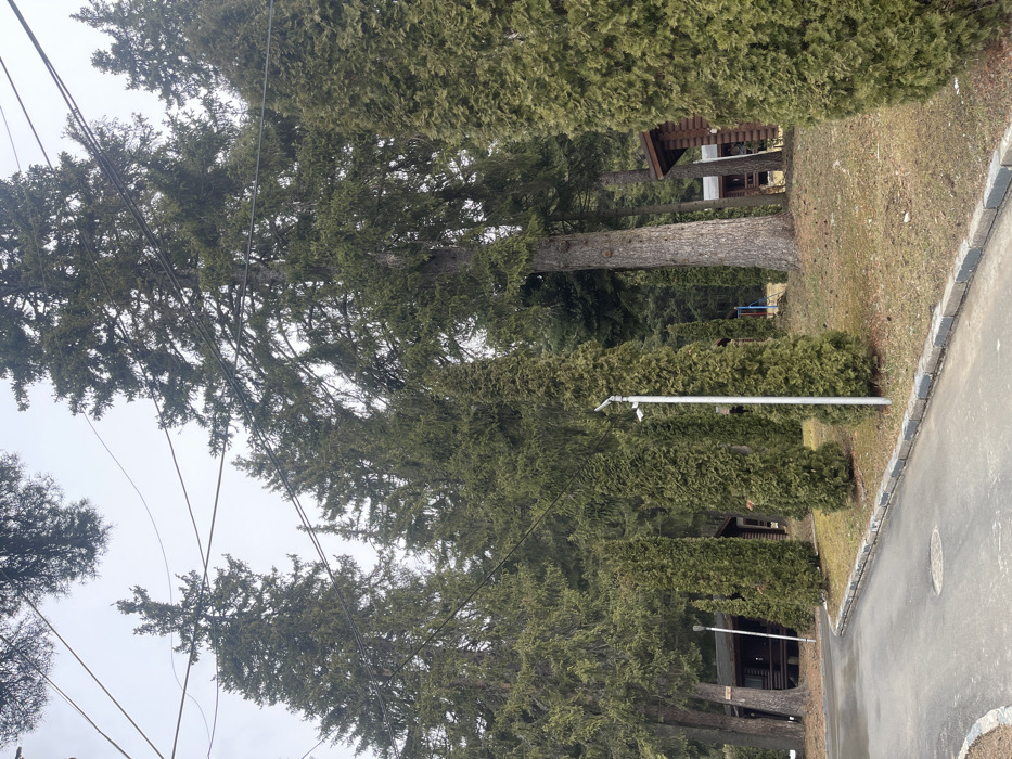 The image displays an outdoor scene in Samokov, Bulgaria, characterized by a predominantly coniferous wooded environment under an overcast, light gray sky. The foreground features a dark gray asphalt road curving gently from the lower left towards the mid-right. The right edge of the road is defined by a curb composed of alternating light and dark rectangular blocks. Adjacent to the curb, a row of cultivated, columnar evergreen trees, approximately 2 to 4 meters tall, lines the right side of the road. Behind this row of evergreens and extending into the background, numerous tall, slender coniferous trees with dark green foliage dominate the landscape, their trunks visible throughout. Several thin, dark utility lines crisscross the upper portion of the image, suspended across the tree canopies. Two light-colored metal poles are present on the right side of the road. One, positioned in the mid-ground, features a dual-arm fixture at its apex, suggestive of a security camera or small light array. A smaller, darker pole is partially visible further down the road on the left. Amidst the background trees, two rustic log cabins or small wooden buildings are partially discernible. One is located on the far left, largely obscured by foliage, while another appears on the far right, also partially hidden, displaying a visible porch area. The ground cover consists of sparse, dry, brown grass, exposed soil, and scattered pine needles or debris. No individuals, animals, or vehicles are present in the scene.