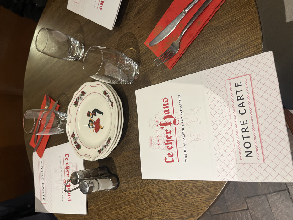 A round wooden table is set for dining, featuring two menus titled "Notre Carte" and "Le Cher Hans, Cuisine Alsacienne par Excellence"