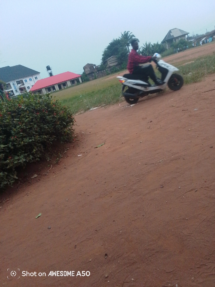An individual is riding a white scooter on a dirt road. Buildings with red roofs and greenery are visible in the background, beneath an overcast sky. A lush green bush sits to the left of the rider. The road occupies much of the lower portion of the frame, displaying tire tracks and scattered debris. The picture appears to have been taken by a device with a branding label that reads, "Shot on AWESOME A50."