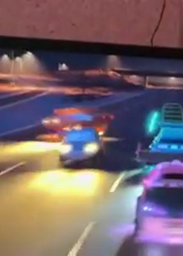 A TV screen displays a cartoon car race at night