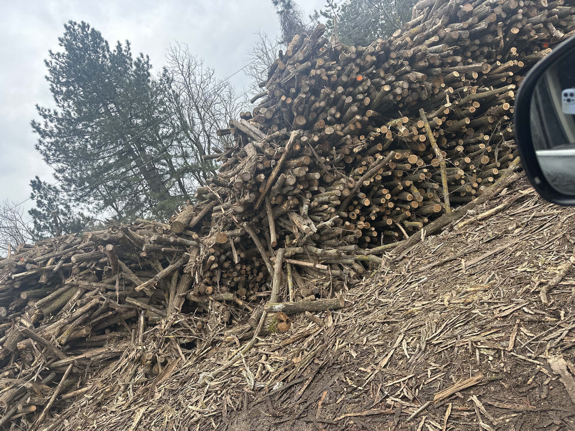 The scene depicts a large, irregularly stacked pile of cut timber and branches in Kalipetrovo, Bulgaria, under an overcast sky. The pile occupies the majority of the frame, extending from the foreground upwards and towards the background. The logs and branches are of various lengths and diameters, with numerous cut ends visible, some exhibiting reddish-orange markings. The ground immediately adjacent to the wood pile is composed of dirt, mud, wood chips, and bark fragments. In the background, a tall, dark green coniferous tree stands prominently on the left, alongside several bare deciduous trees. A portion of a vehicle's side-view mirror is visible in the upper right, reflecting a glimpse of a smartphone's camera array and what appears to be vehicle interior elements. No individuals or active actions are depicted.