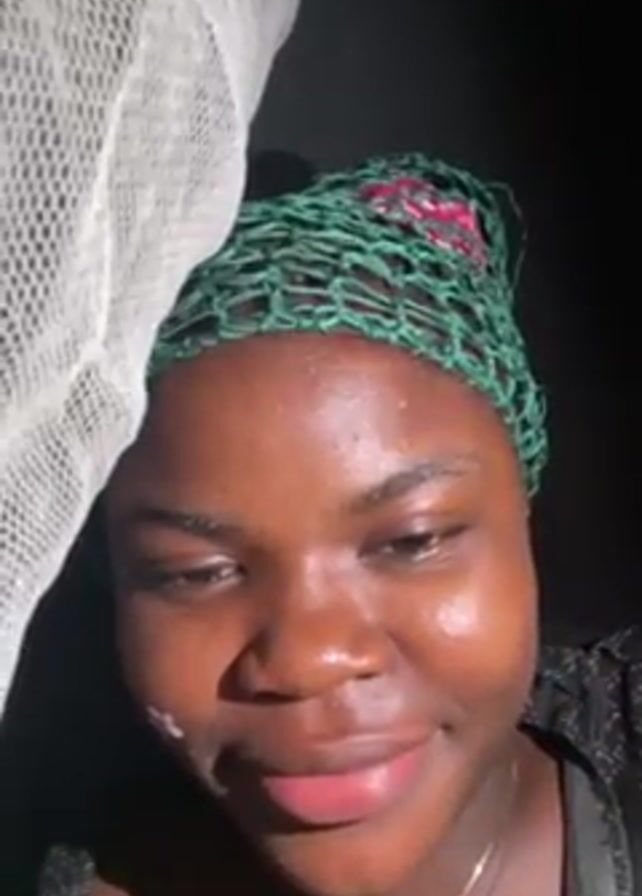 A person with dark skin, wearing a green net-like head covering, is sitting indoors