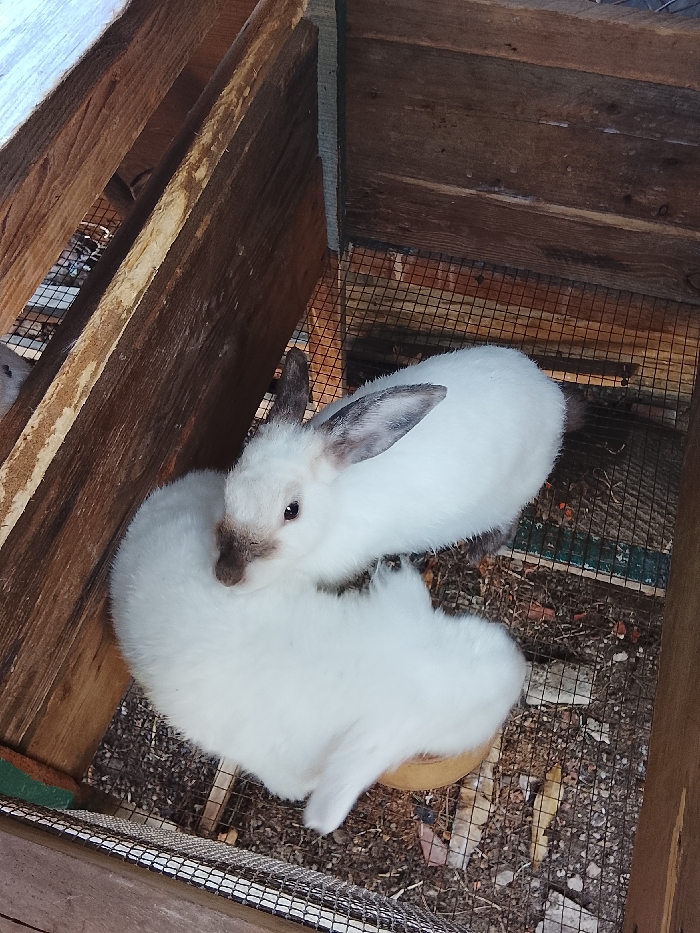 - "The image depicts two white rabbits inside a wooden and wire-mesh hutch, located in San Antonio, Venezuela" by FM-FtvzI3, licensed under CC BY 4.0