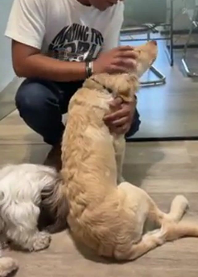 A man crouches on a wood-patterned floor and pets a light yellow dog. A small white dog lies behind the yellow dog. The man is wearing a white t-shirt with black text and blue jeans. He is looking down and stroking the yellow dog's head and neck. The yellow dog is sitting on its hind legs, tongue sticking out. In the background, there is a partial view of a shiny metal desk and a white wall.