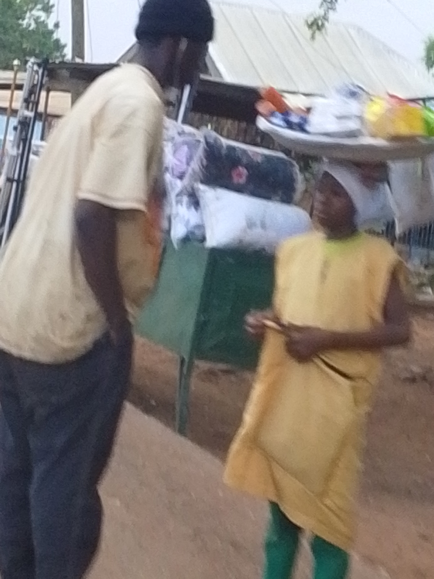 two individuals engaged in an interaction on what appears to be a street in an urban environment, possibly the city of Tamale, Ghana, although that is not definitively confirmed in the image. One individual, possibly male, wears a black beanie, a tan t-shirt, and dark-colored pants. He stands with his hands in his pockets, facing the other person. The second individual, possibly female, wears a white head covering, a yellow tunic-like garment, and green leggings. She holds something in her hands. On her head, she balances a tray containing various items, including what appear to be packaged goods or food items. Behind them, there's a green table-like structure and some indistinct objects that could be merchandise or other items. The background also includes a building with a corrugated metal roof. The environment appears to be outdoors and possibly a roadside setting.