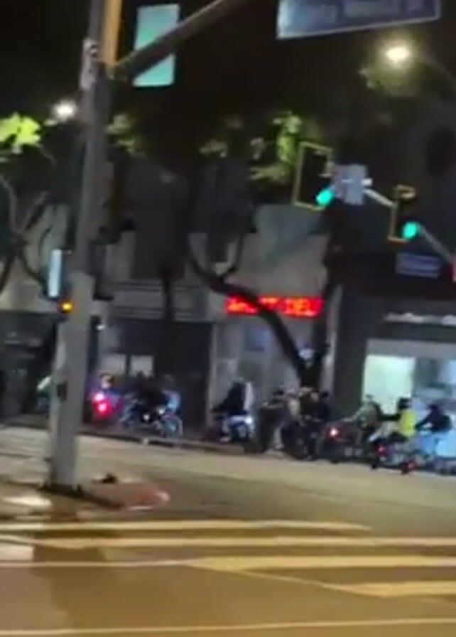 At night, a group of individuals on bicycles is seen riding through an intersection with traffic lights. Some cyclists have bright lights attached to their bikes. The streetlights illuminate the scene, revealing businesses with neon signs in the background. The street is marked with pedestrian crosswalks. The camera appears to be handheld and has some movement.
