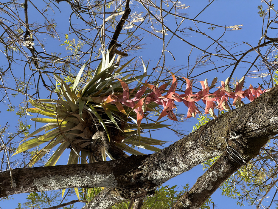 A low-angle shot displays a tree branch supporting a large bromeliad with spiky green leaves. An extended inflorescence with pink, leaf-like structures extends from the bromeliad along the branch. The branch's bark is textured with light patches and darker areas. Surrounding the branch, delicate twigs and new leaves reach toward a bright blue sky.
