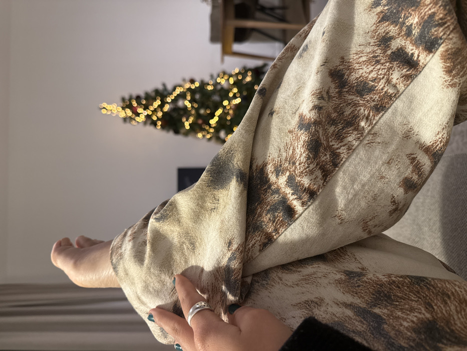 A close-up shows a person's legs crossed in front of a blurred Christmas tree with golden lights. The focus is on the pants, which feature a tan and brown animal print. A hand with teal nail polish and a silver ring is visible, resting on the pants. The background includes a glimpse of a neutral-colored couch and the room's decor. The image is taken indoors with natural lighting.