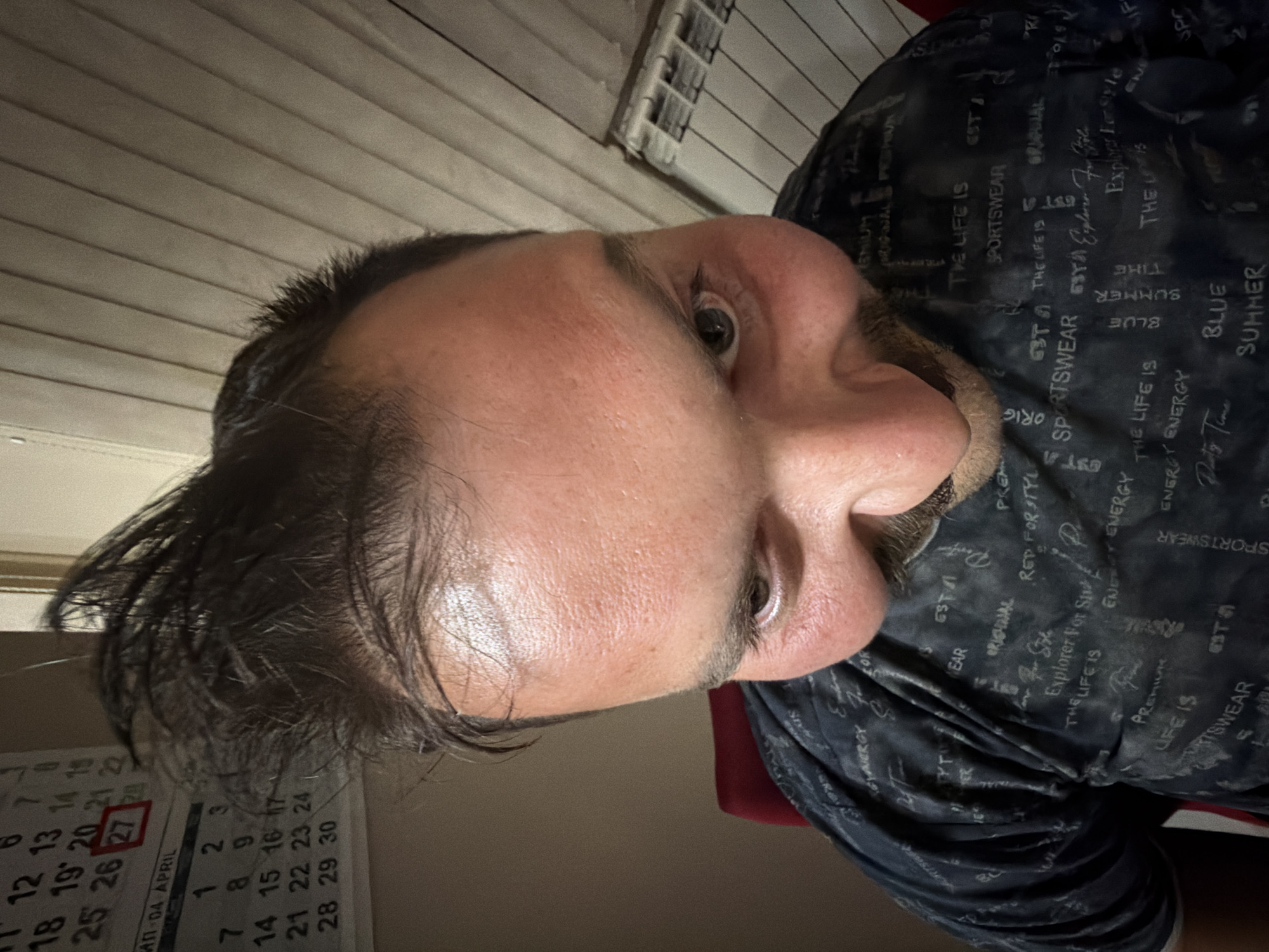A close-up, rotated selfie of a middle-aged man with dark hair and a beard. He is wearing a patterned dark blue shirt with words printed on it. Behind him is a calendar with April 27 circled in red. Further behind the calendar is a white radiator. There is no mention of Sandanski, Bulgaria, in the image.
