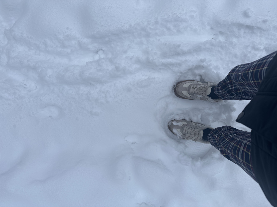 A person stands in deep snow, wearing tan and white sneakers. Their lower legs are visible, clad in plaid pants. A black coat edge appears on the right. The surrounding snow is pristine and undisturbed, with varying depths and textures. The perspective is from directly above.