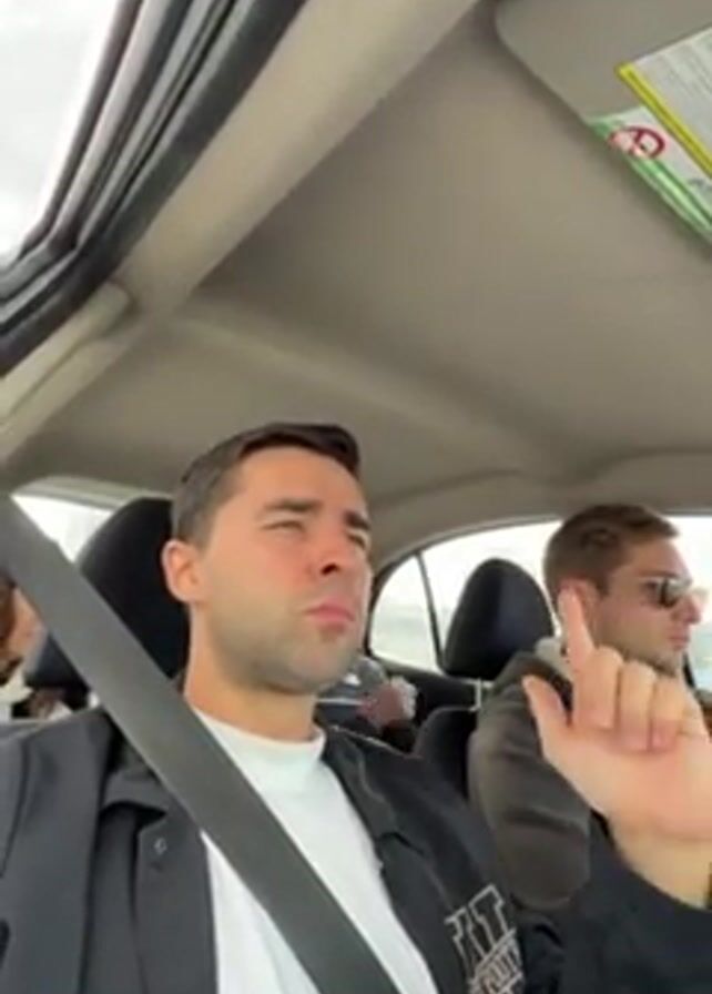interior of a car, with a man in the front passenger seat wearing a white shirt and black jacket, with the seatbelt fastened. He appears to be listening intently, possibly to music, as he moves his head slightly and raises his finger briefly. The driver, a man wearing sunglasses and a jacket, is focused on the road ahead. Two more people can be seen in the back seats, with only the head of one visible. The car is driving on a road with other vehicles visible through the windows. The interior of the car is fairly standard, with a sun visor and ceiling lining visible at the top of the frame. The weather outside appears overcast.