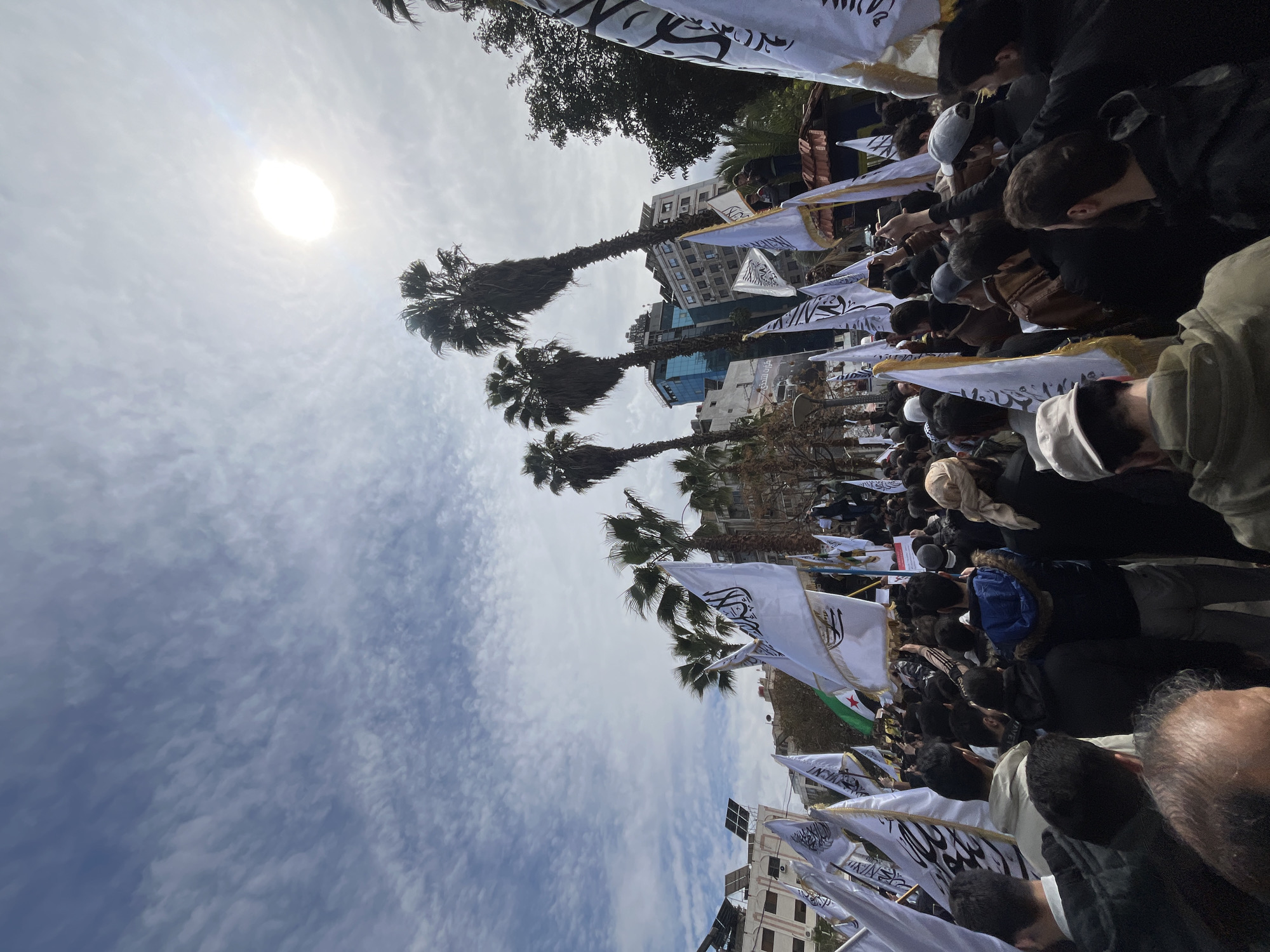 The image depicts a dense outdoor public gathering in an urban area of As-Salihiya Municipality, Syria, under a partly cloudy sky with bright sunlight