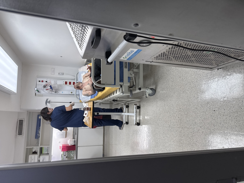 A hospital room features a nurse tending to a patient on a hospital bed. The patient is shirtless, displaying tattoos on his torso and arms. The nurse, wearing a blue uniform, stands beside the bed with a tray. Medical equipment is mounted on the wall, and supplies are on shelves in the background. A large air filtration unit hangs above. The scene is observed through a doorway or window frame, lending a voyeuristic perspective.