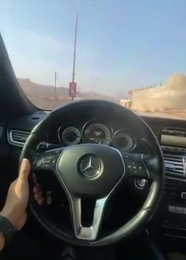 A person is driving a Mercedes-Benz on a paved road. The driver's right hand is visible on the steering wheel. The dashboard and windshield show the road ahead, featuring telephone poles, mountains, and a walled structure. The camera angle then shifts to show the driver, a man with a beard wearing a purple t-shirt and jeans. The setting appears to be during the daytime.