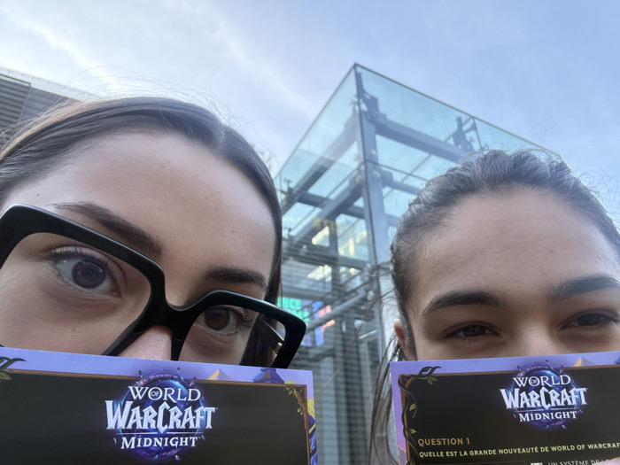 The image displays two individuals posing outdoors in Paris, France, specifically in the vicinity of the Forum des Halles. In the foreground, the upper portions of their faces are visible, as they each hold up a promotional card. The individual on the left has dark hair and wears black-framed glasses, while the individual on the right has dark hair pulled back. Both individuals directly face the camera. Each holds a purple-themed card prominently displaying the "World of Warcraft Midnight" logo. The card held by the individual on the right also features French text, including "QUESTION 1" and "QUELLE EST LA GRANDE NOUVEAUTE DE WORLD OF WARCRAFT". The background consists of a clear, light blue sky with minimal cloud cover, a modern building facade partially visible on the upper left, and a distinctive multi-story, cuboid glass and metal structure characteristic of an entrance or pavilion at the Forum des Halles complex.