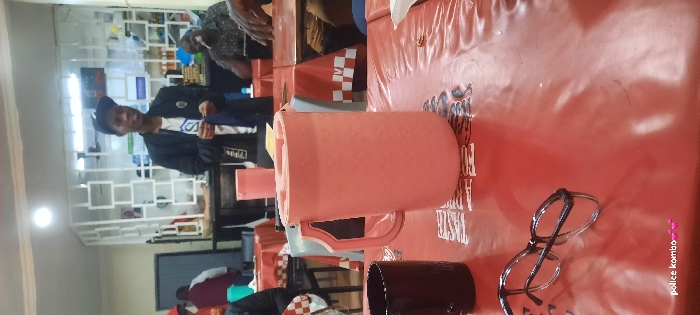 The scene depicts an indoor area of a restaurant or eatery located in Homa Bay, Kenya. In the foreground, a table covered with a red, somewhat wrinkled plastic tablecloth is visible. Centrally positioned on this table is a large, pale pink plastic water pitcher with a textured surface and a light-colored lid. To the left of the pitcher, a dark-colored cylindrical mug stands. A pair of black-framed eyeglasses rests on the lower-left portion of the tablecloth. In the midground, a young male stands, facing slightly towards the right, with his hands engaged with a small, dark piece of fabric or paper. He wears a dark baseball cap positioned backward, a dark jacket over a white t-shirt featuring a dark "S" logo, and dark trousers. Behind him and to his right, a seated male with a patterned shirt is visible at a table covered by a red and white checkered tablecloth. This individual has his hands on the table, with a thin dark object near his mouth. Additional, partially obscured individuals are visible at tables to the left and further in the background. The background elements include a white, open-shelf partition or room divider. Behind this partition, a counter area is discernible, displaying bottles and other items. The space is illuminated by overhead lighting, including a prominent circular ceiling light. The environment indicates an active, informal dining or social establishment.