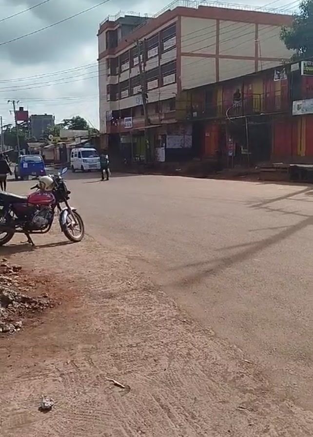 street scene in a small town. A red motorcycle is parked on the side of the road next to a pile of rubble that is partly covered by orange netting. A sign for "Miracle Revival Fellowship Pentecostal Church- Gachie Branch" is visible above the sidewalk. The road itself is mostly empty, with a few pedestrians and vehicles visible in the distance. The buildings along the street appear to be a mix of residential and commercial properties, and the overall environment seems somewhat run-down. The sky is overcast, and power lines are strung across the street.