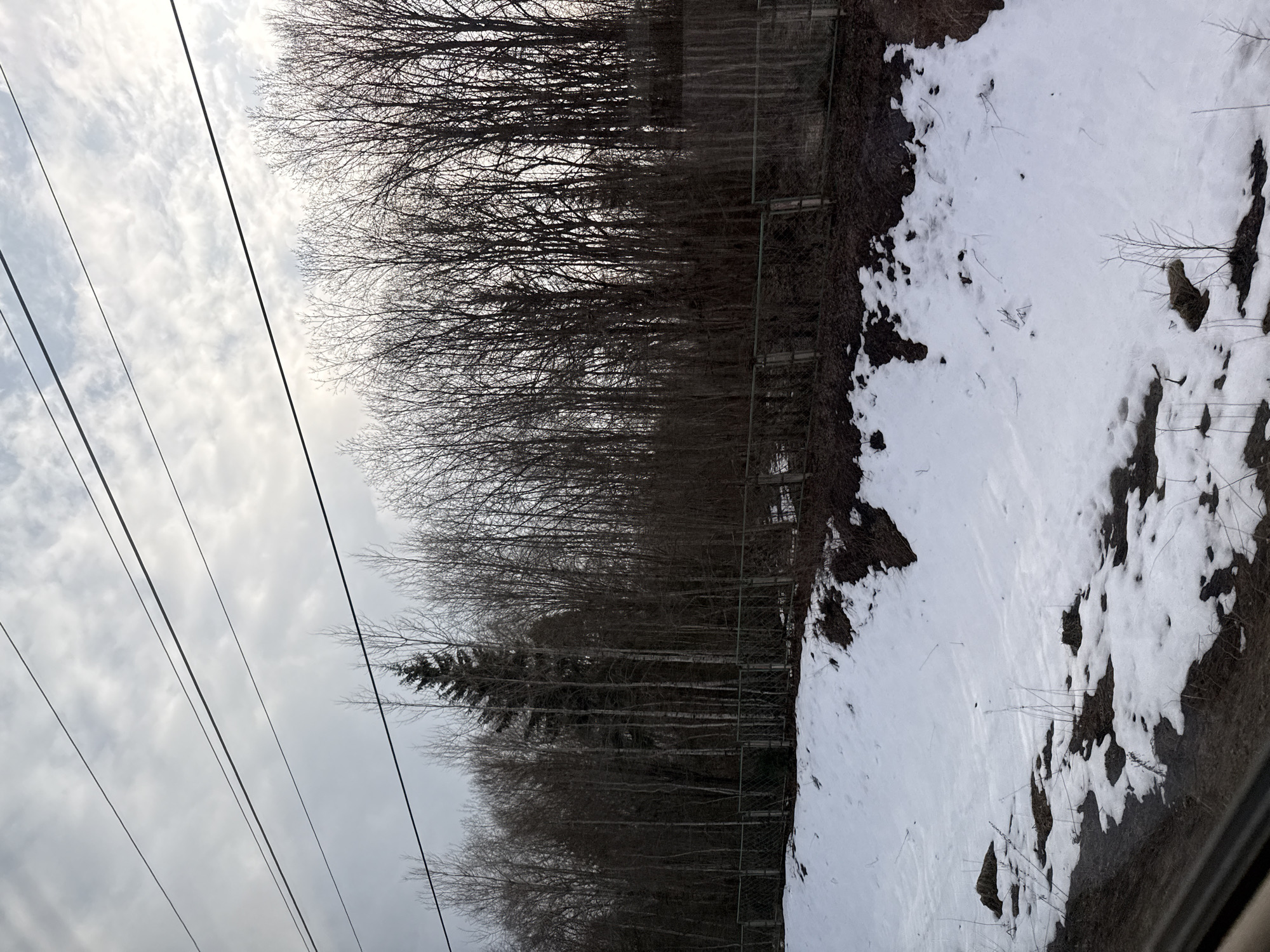 The image depicts a winter scene, with snow covering the ground. Bare trees line the edge of the snow-covered area, and a wire fence is visible along the treeline. Power lines run across the sky in the upper left portion of the frame, and the sky appears overcast with clouds. The location appears to be a rural or suburban area.