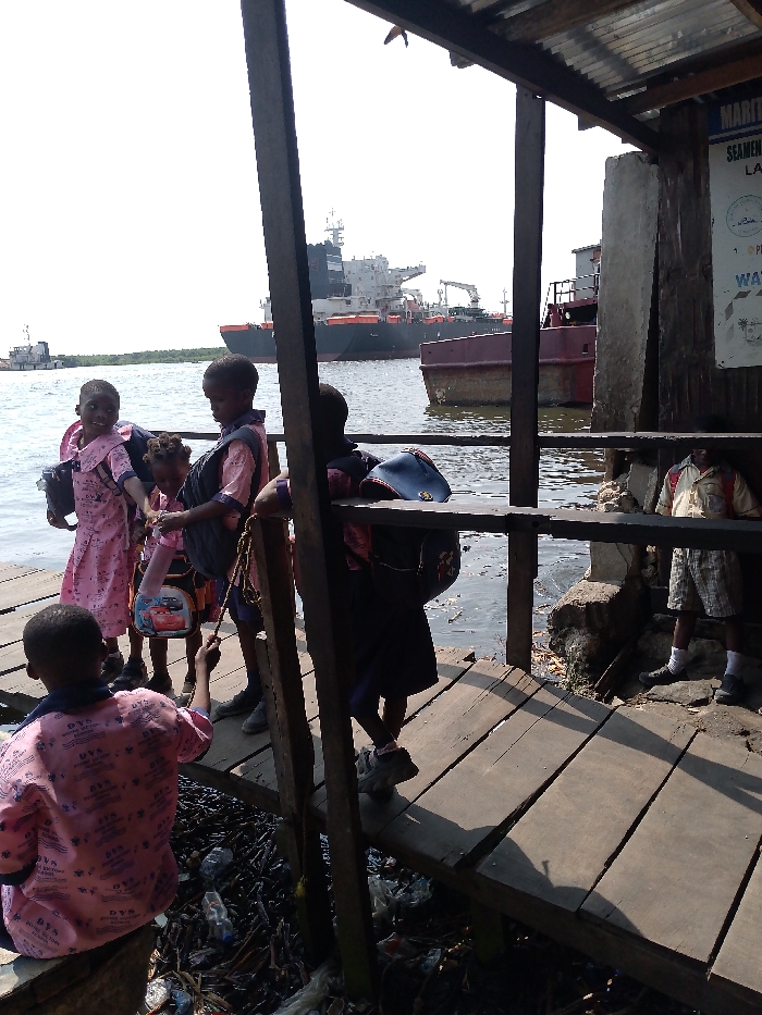 The image captures a sunny waterfront scene in Lagos, Nigeria, at what appears to be a dilapidated wooden jetty or embarkation point, likely along the Lagos Lagoon or an associated channel