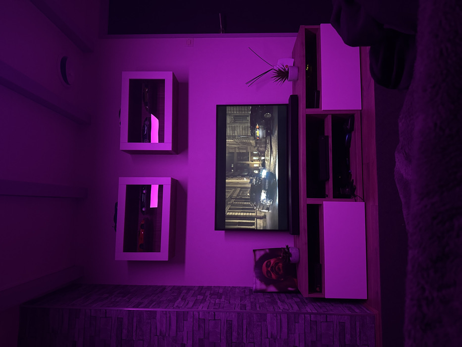 A room is lit in purple hues. A television displaying a nighttime street scene hangs on the wall, flanked by two square display cases. The left case contains a model car, while the top case features what appears to be a black purse. To the right of the television is a shelving unit with white doors, holding various items. A small potted plant sits atop the unit. A picture of a person's face is on the floor. A stone tiled floor completes the scene.