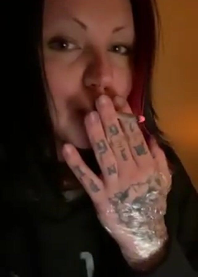 A woman with dark hair and pink streaks is centered in the frame. She is shown from the chest up, with her head tilted slightly downward. She is smoking a rolled cigarette or joint, holding it with her left hand, which is covered in clear plastic wrap and has visible tattoos. She is wearing a black hoodie and a thin gold chain. Her facial expression is relaxed. The background is dimly lit with warm orange light.