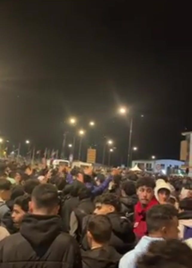 At night, a dense crowd fills an open urban space illuminated by streetlights. The crowd appears to be predominantly young men, wearing a variety of casual clothing. Some people are raising their arms, and there seems to be movement throughout the group. In the background, flags are visible, suggesting a possible celebration or gathering. There are some structures in the background that appear to be white tents or temporary buildings.
