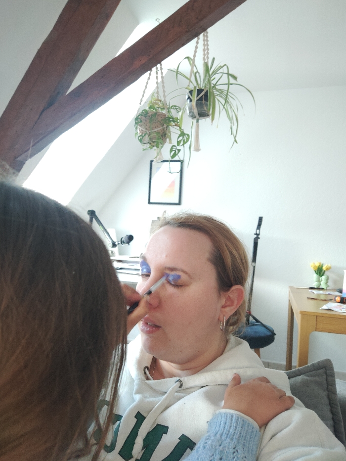 In an interior setting identified as the city of Schiltigheim, France, two individuals are depicted. A person with long brown hair, visible from behind, is applying purple eyeshadow to the right eyelid of an adult female using a makeup brush. The female receiving makeup has light hair, wears a white hooded sweatshirt with green lettering, and silver hoop earrings. Her gaze is directed downwards. A small hand, wearing a light blue knitted sleeve, rests on the female's left shoulder. The background features a white sloped ceiling with exposed wooden beams. Two potted plants in macrame hangers are suspended from the ceiling, one a spider plant and the other a leafy green plant. Below them, a framed abstract artwork hangs on the white wall. To the right, a light wooden table holds a vase with yellow tulip-like flowers and assorted items. A black stand and a grey cushion are also visible in the mid-ground.