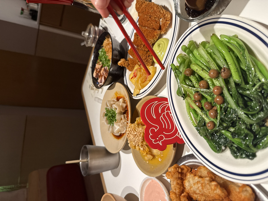 The image displays an indoor dining scene at a restaurant in Thủ Đức, Vietnam, featuring a white table laden with various food dishes. In the foreground, a white oval plate with blue stripes holds steamed green leafy vegetables topped with small, dark brown, spherical objects. To its immediate left, a metal plate contains several pieces of golden-brown fried food. To the right, a partial view of a clear glass bowl shows dark, round objects submerged in a liquid. In the mid-ground, from left to right: a small white bowl contains a pink sauce; a beige plate holds shredded poultry or meat covered in crushed peanuts and a yellow liquid; a red, heart-shaped decorative cutout with a white rooster silhouette is prominently placed. Next to this, a white oval plate presents several breaded and fried cutlets, alongside yellow pickled vegetables and a dollop of green sauce. A human hand, holding red chopsticks, is actively gripping a piece of the yellow pickled vegetable from this plate. In the background, a silver metal cup with a straw stands on the left. A beige plate holds several steamed dumplings in a reddish chili oil, garnished with chopped green onions. A black bowl contains a rice dish topped with salmon pieces, green onions, and crispy fried elements. Further right, a small clear condiment shaker is visible. The immediate background shows a muted environment with light brown and off-white wall panels and a glimpse of a red booth seat on the far left.
