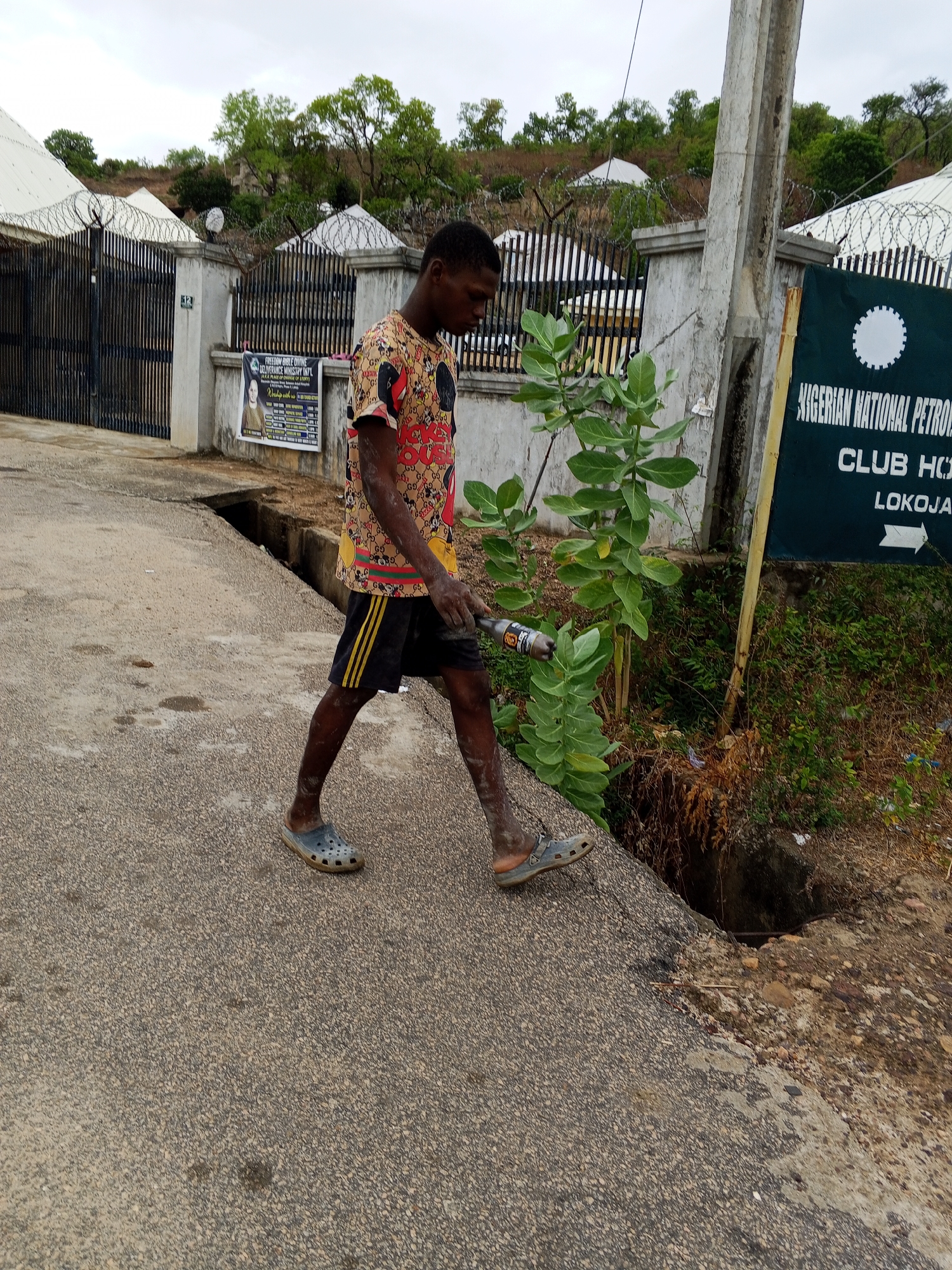 A man is walking along a road in Lokoja, Nigeria. He is wearing a patterned t-shirt, shorts, and sandals. His legs and arms appear soiled. He is carrying a cylindrical object. The road is cracked, and there is a drainage ditch to the right. A sign for the "Nigerian National Petroleum Club HO Lokoja" is visible. In the background, there is a building with barbed wire fencing.