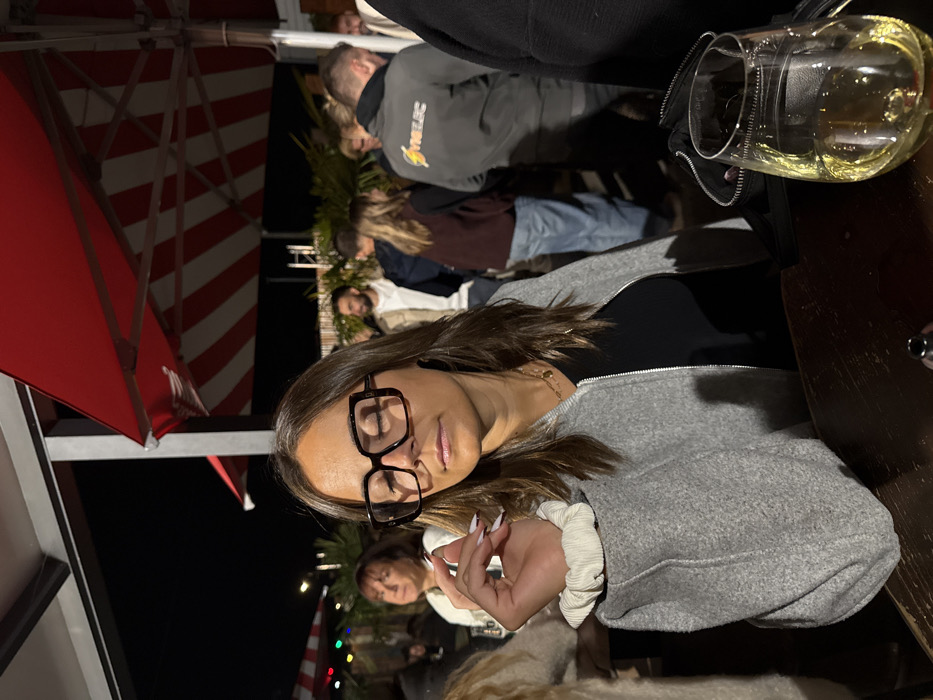 This image depicts an outdoor evening social gathering located in Andrézieux-Bouthéon, France. A female subject is positioned centrally in the foreground, with her eyes closed, wearing large, dark-framed eyeglasses. She has medium-length brown hair and wears a light grey zippered bomber jacket over a black top, with a golden multi-charm necklace. Her left hand, displaying white-tipped manicured nails, rests on a dark wooden table, with a white, ribbed scrunchie on her wrist. On the table to the right, a stemmed glass containing a light-colored liquid, consistent with white wine, sits adjacent to a small black zippered pouch. The background is dimly lit at night, revealing numerous other individuals out of focus. Notable figures include an older woman with short dark hair in a white top to the left, and a man in a grey jacket with a yellow and black 'ENILEC' lightning bolt logo on his back, facing away, in the mid-ground to the right. The environment includes red and white striped umbrellas, festive string lights, and some decorative palm-like plants, indicating a casual outdoor venue.