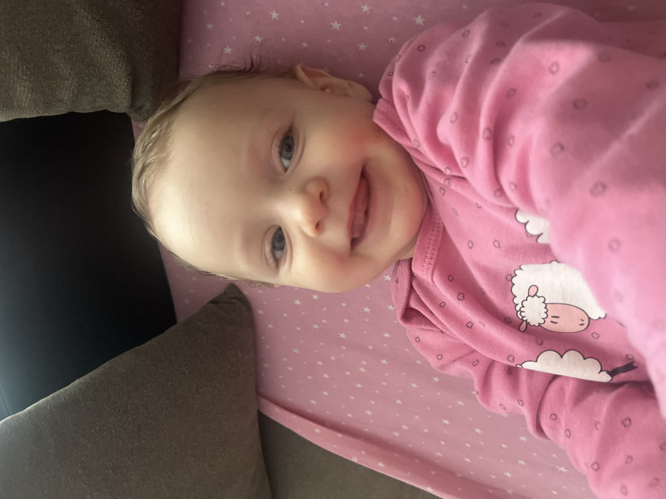 A close-up image depicts an infant, characterized by light skin, blue eyes, and fine, light-colored hair, smiling broadly with the tongue slightly visible