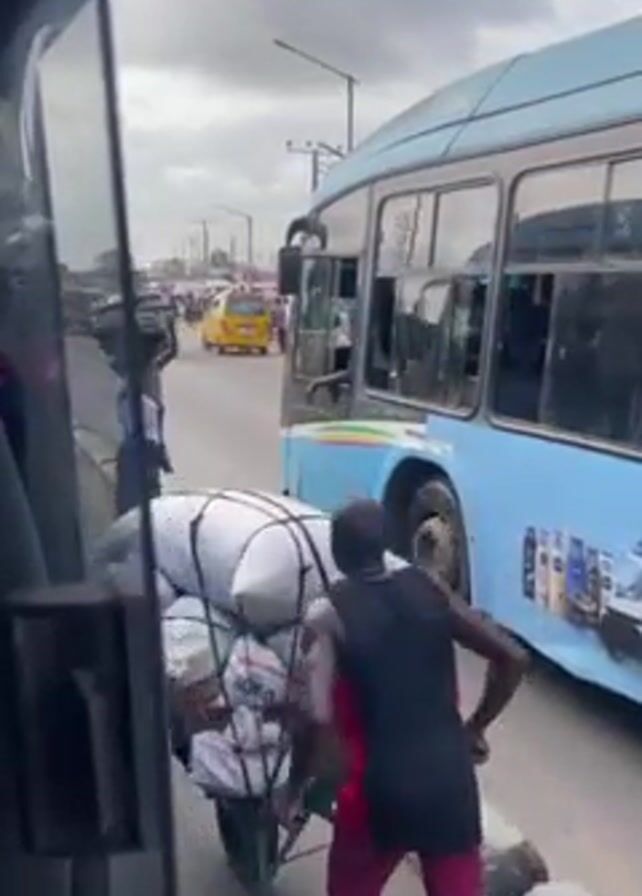 blue public transit bus driving on a city street with a sidewalk along its side. Other cars and motorbikes are visible on the street as well. The sky is overcast. Passengers appear to be in the bus. The bus has a Nivea ad on the side, saying "WIN #3 BILLION." A woman is seen walking on the sidewalk.
