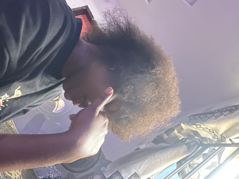 - "A medium-shot portrait depicts a dark-complexioned individual with voluminous, brown, kinky hair, seated indoors in the city of Ipetumodu, Nigeria" by FM-rP9JX2, licensed under CC BY 4.0