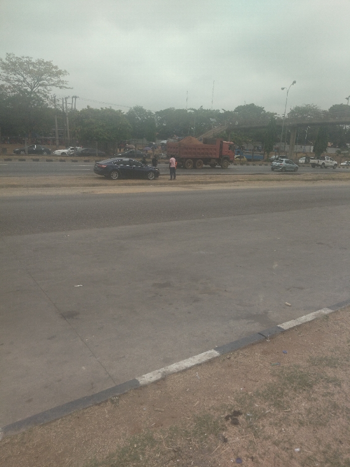 four-lane road with a grey surface and a white dividing line. There is a black car parked on the shoulder of the road, with two people standing near it. In the background, there is a red dump truck loaded with dirt, parked on the side of the road. The truck has a large amount of dirt in its bed. The image was taken on a hazy day. The image is located at latitude 9.046 and longitude 7.536 in Aso, Nigeria, which is a suburb of Abuja. There is a large amount of greenery on the side of the road where the image is taken from. The image is taken from the ground looking towards the road, and the road looks to be empty.