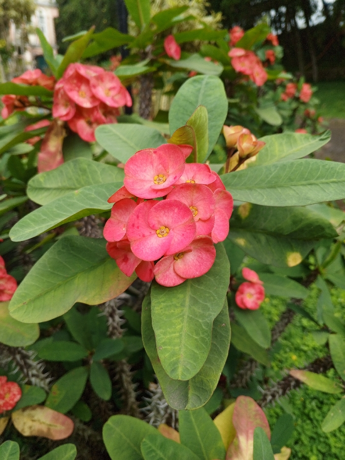 This image depicts a close-up of a flowering *Euphorbia milii* (Crown of Thorns) plant, located in the city of Weintiapa, Liberia. The central subject is a cluster of approximately eight vivid pink to reddish-pink bracts, each featuring a small yellow true flower at its center, in sharp focus. These bracts are surrounded by multiple oval-shaped, dark green leaves. The plant's stems exhibit prominent, sharp, grayish-brown thorns. Additional clusters of similar pink flowers and green foliage are visible in the blurred mid-ground and background. The ambient environment appears to be an outdoor setting, potentially a garden or cultivated area, with a heavily out-of-focus background showing further green vegetation and a faint, light-colored structural element in the upper left corner. No human figures or explicit actions are present within the scene.