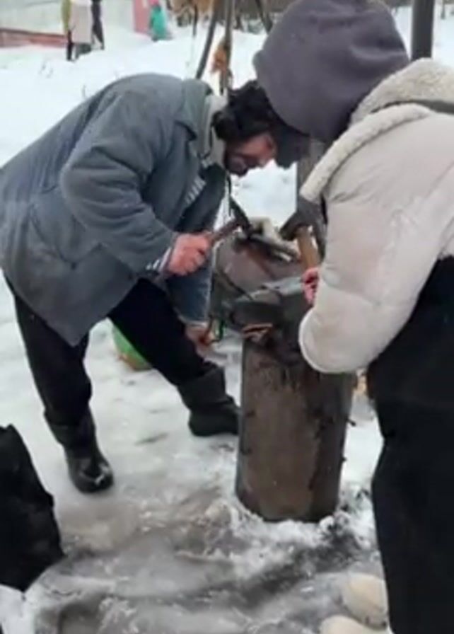 two people blacksmithing outside in the snow. One person is a man with a beard, wearing a blue coat and dark pants. He is squatting and striking a piece of metal with a hammer. The other person is standing next to him, also holding a hammer. They are wearing a white jacket, black pants, and light-colored boots. Both are focused on the metal they are working on, which is resting on a wooden stump. There is a makeshift forge nearby, and some animal pelts hanging behind them. The ground is covered in snow and ice. In the background, there is a yurt and other people.