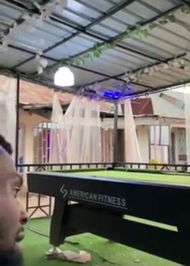 man standing next to a pool table on an outdoor patio