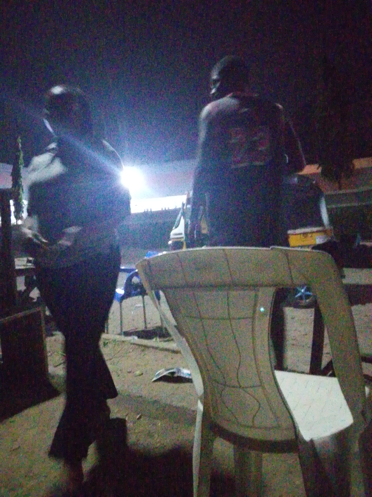 In Lokoja, Nigeria, the image presents an outdoor night scene. Two figures are visible, their features obscured by darkness and possibly low image quality. The first figure, to the left, is standing and appears to be wearing dark clothing. The second figure is seated in the right side of the frame, on a white plastic chair. In the background, there are bright stadium lights. Several other chairs are scattered around the space. Debris is scattered on the ground.