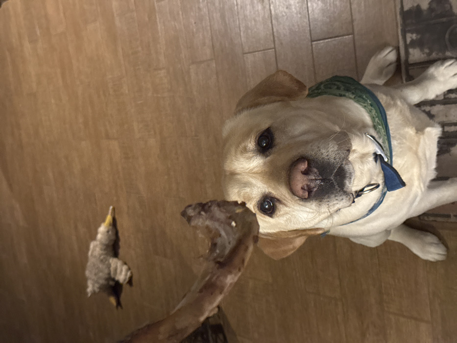This image depicts an indoor scene within a residence in Samoranovo, Bulgaria. A light-colored Labrador Retriever dog, wearing a blue collar and a green patterned bandana, is seated on a light brown, wood-effect plank floor. The dog is positioned centrally in the frame, looking upward with a focused gaze towards a large bone, possibly a leg bone with some tissue remnants, being held by an unseen individual from above and to the left of the dog's head. In the upper left background, a grey, plush toy resembling a bird with a yellow beak lies on the floor. The lighting suggests an artificial indoor light source.