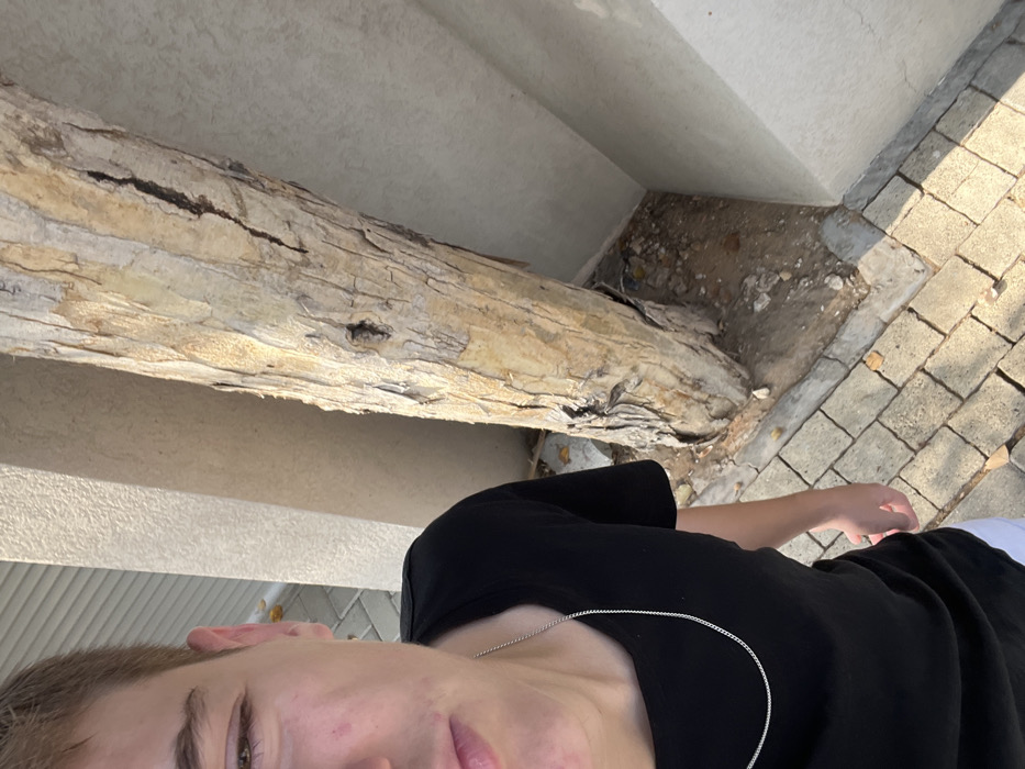 A partial view of a person standing outdoors in Tel Aviv, Israel, positioned to the left of a prominent tree trunk and adjacent to building elements
