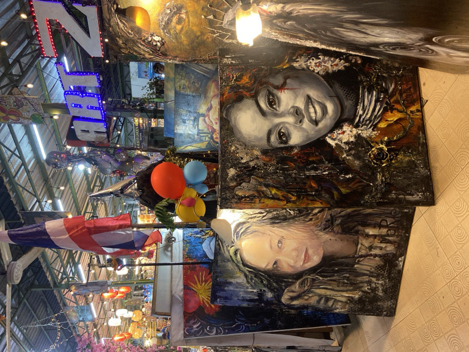 This image captures an art stall within a covered market in Pattaya City, Thailand