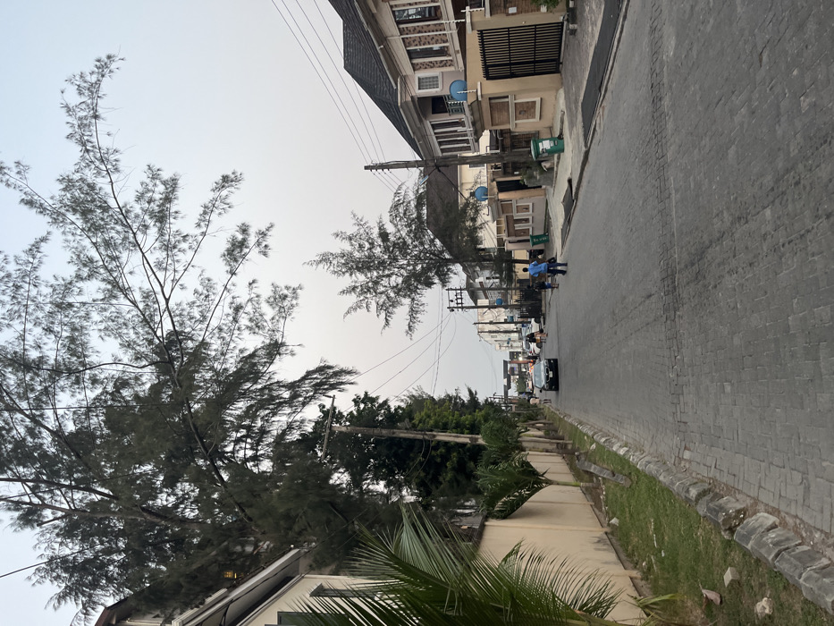 The image displays a residential street in Ojomu, Nigeria, viewed from a low angle under a pale grey-blue, hazy sky. The road surface consists of grey interlocking pavers, extending into the background. On the left side, a cream-colored perimeter wall, featuring a horizontal molding, runs alongside the road. A narrow grass strip, edged by grey concrete curbing, is situated between the wall and the road, containing several small palm trees. Behind this wall and trees, a section of a light-colored multi-story building with dark-framed windows and a green shutter is visible. Large, mature trees with dense, needle-like foliage overhang the street from this side. A wooden utility pole carrying multiple wires stands adjacent to the wall. The right side of the street is lined with several multi-story residential buildings, predominantly light-colored with dark roofs and secured by metal gates. One building is equipped with two blue satellite dishes. A green cylindrical waste bin is visible on the sidewalk in front of one property. Further down, another utility pole fitted with transformers and numerous electrical wires is present. Multiple individuals are observed on the street. In the mid-ground, two people walk away from the camera on the right side of the road; one wears a blue shirt, the other a white shirt. Other figures are less distinct in the distance. A dark-colored sedan is positioned in the center of the road, appearing to move towards the camera. The streetscape continues into the background, revealing more buildings, trees, and utility poles.