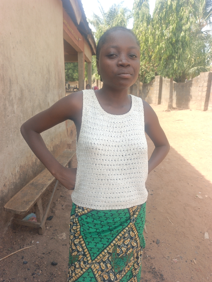 A young female stands outdoors in Akwanga, Nigeria. She faces forward, wearing a light-colored, possibly cream, sleeveless top with a distinct open-weave pattern, and a green patterned wrapper adorned with yellow, black, and brown designs. Her hands are positioned on her hips. To her left, a light brown plastered building wall and a wooden bench are visible. In the background, a building entrance with an overhang is present. To her right, a rough concrete block wall and several tall green trees are observed. The ground consists of unpaved reddish-brown earth. The scene is illuminated by natural sunlight, casting shadows.