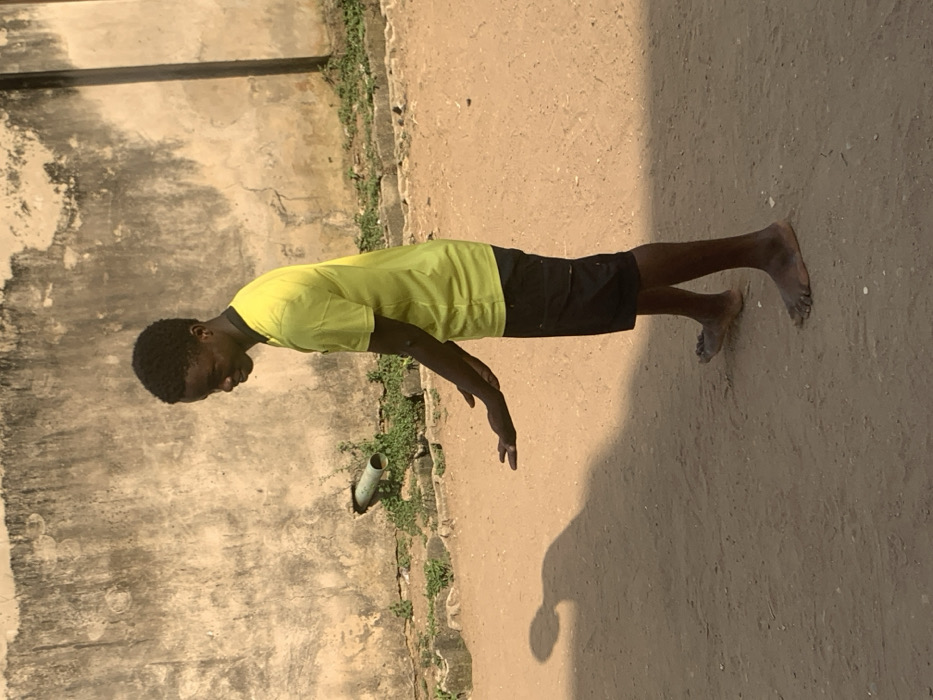 A young man wearing a light green shirt and dark shorts is lying face down on a dirt surface. He is barefoot and appears to be pushing himself up. A wall is visible in the background on the left, with some vegetation growing near the base. A pipe protrudes from the wall. The scene is brightly lit, casting a distinct shadow of the man on the ground.